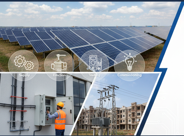 We provide end-to-end Supply, Erection, Testing, and Commissioning (SETC) services, with expertise in obtaining Electricity Board Sanctions and Electrical Inspector Approvals. Our work spans across industries, solar power projects, commercial buildings, and residential complexes throughout Telangana and Andhra Pradesh.